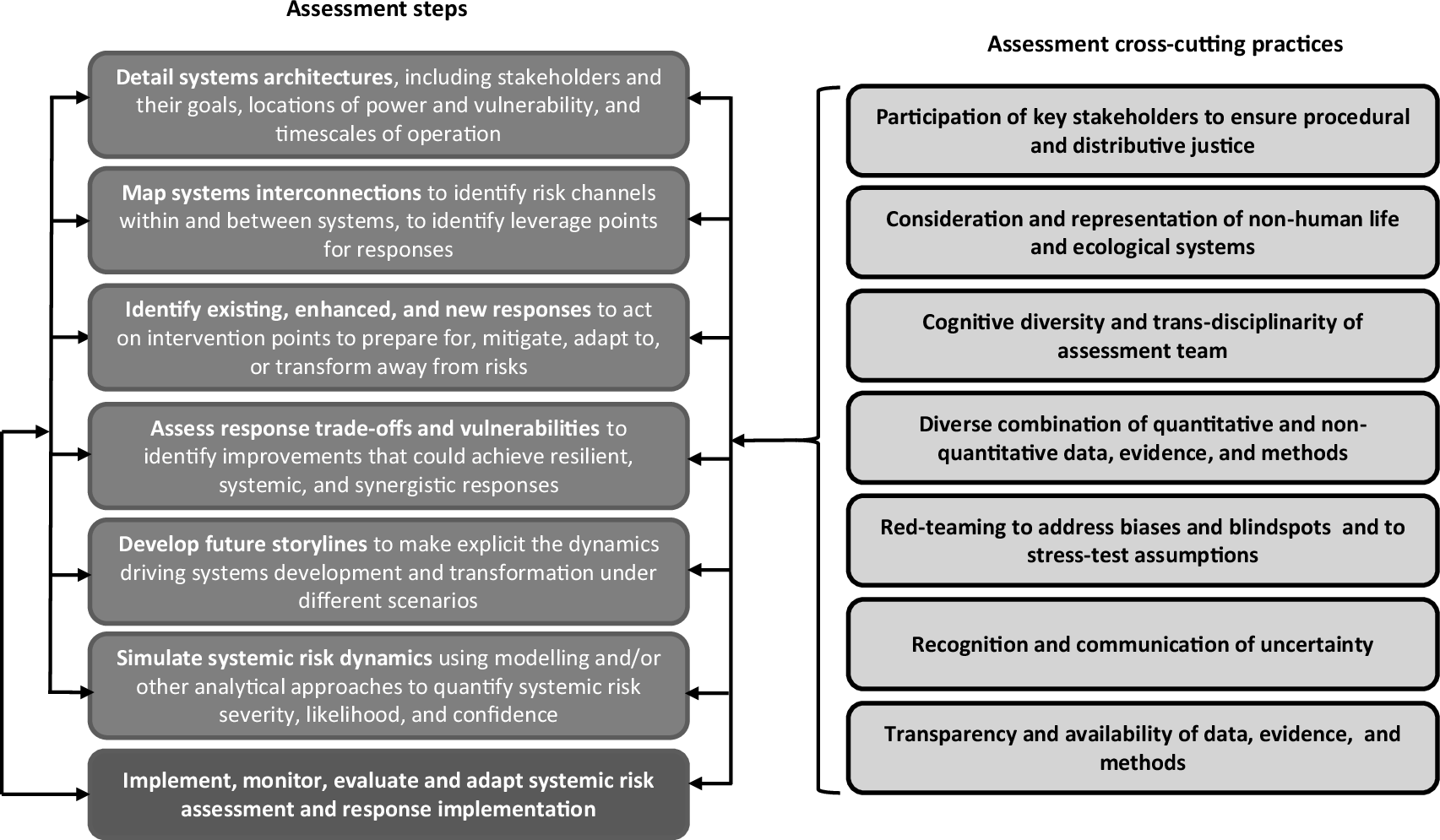 The figure depicts (left-hand side) seven systemic risk assessment steps and (right-hand side) seven cross-cutting practices to be applied across each of the assessment steps. The steps are intended to be undertaken in the logical order shown, but the arrows indicate that that each step can and should if necessary, be returned to once other steps have been undertaken. As such, the framework is not prescriptive in its sequencing of steps. The arrow (left-hand side) from the ‘implement, monitor, evaluate and adapt’ step to the other steps is indicative that, once systemic risk assessments and responses have been implemented, they can and should, where necessary, lead to review and revision of each of the other steps. Produced by authors.