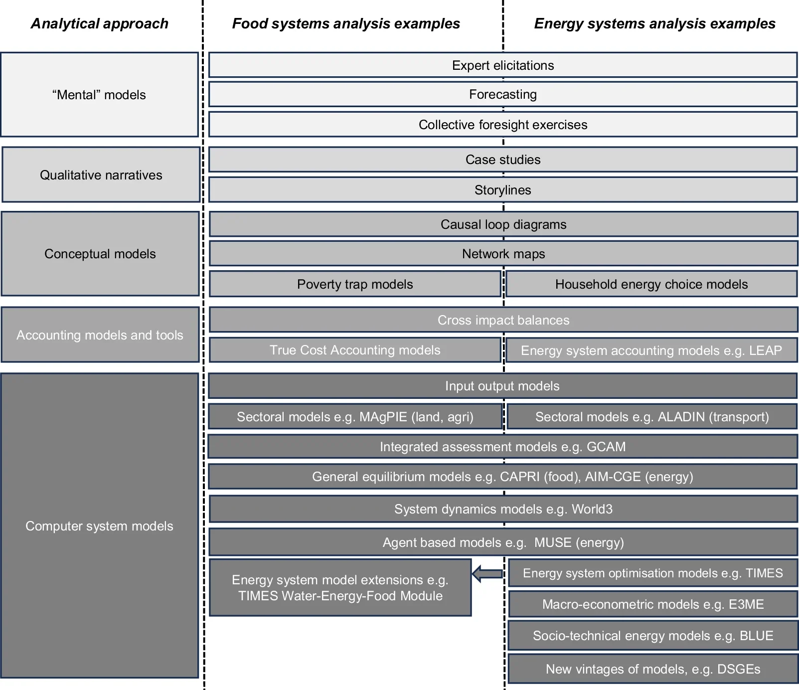 This figure shows a range of analytical approaches and models, with specific examples given for food and energy systems, ranging from mental models which are not formalised into structured relationships between variables, to mathematical, computer system models which do represent such structured formalisation. Intermediate stages (qualitative narratives, conceptual models and accounting models and tools) represent an increasing extent of formalisation and mathematical structure. Grey-scale differentiation is added only to distinguish categories of analytical approach and has no inherent implication. Each of these analytical approaches can be incorporated into the systemic frameworks in Table 1. It should be noted that mental models can encompass very different boundaries of systems, depending on the question and scale of analysis. Full details in Supplementary Data 1. Produced by authors.